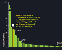 A new analysis of the IPOs from the last ten years, from Geckoboard, says that--if successful--the IPO of Venice, California-based Snap, Inc. will be the fourth largest IPO in the last 10 years, behind Alibaba, Facebook, and JD.com, and ahead of Twitter, VMware, and Renren. Geckoboard said it compared the 100 highest-valued tech companies that went public in the last decade to Snap's rumored IPO valuation.