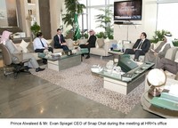 Venice, California-based Snapchat is in discussions with Saudi Arabian Prince Alwaleed bin Talal, over possible future funding for the company, according to the Prince's investment firm, Kingdom Holding Company. According to KHC, Prince Alwaleed bin Talal met with Snapchat CEO Evan Spiegel, along with Imran Khan, Chief Strategy Officer, Snapchat over the weekend, at the Prince's Kingdom Resort. Kingdom Holding Company did not reveal any other details of the possible investment. Prince Alwaleed bin Talal's investment company owns huge stakes in such companies as Citigroup, 1st Century Fox, the Fairmont New York Plaza, Twitter, and many other U.S. companies, and says the Prince is the largest individual foreign investor in the United States.